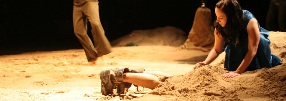 The piece takes shape in a natural landscape, a sort of sandy beach.