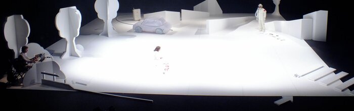 “On the moon and the day after” is built around absurd and surreal situations, with a flow that permeates and binds the elements together, albeit in a subtle and paradoxical way. We find ourselves in a white space that slightly suggest a urban landscape. A dreamlike atmosphere, with cinematic science fiction references, where the tension plays between dark humor and poetical non-sense. This loads of distillated situations invites us to examine how we relate to, and discriminate between, personal and impersonal, natural and constructed.