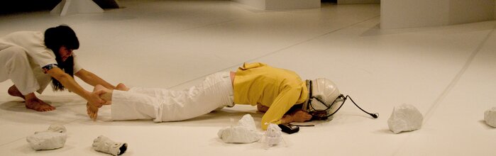After the Surprised body project (2010>ongoing), which focuses on a research that see the body and the movement as its central element, with “On the moon and the days after”, Wee returned to work on a project where the physicality exists on the same level, and with equivalent valor, with text, theatrical action, conceptual situations, visual art and sound installations.